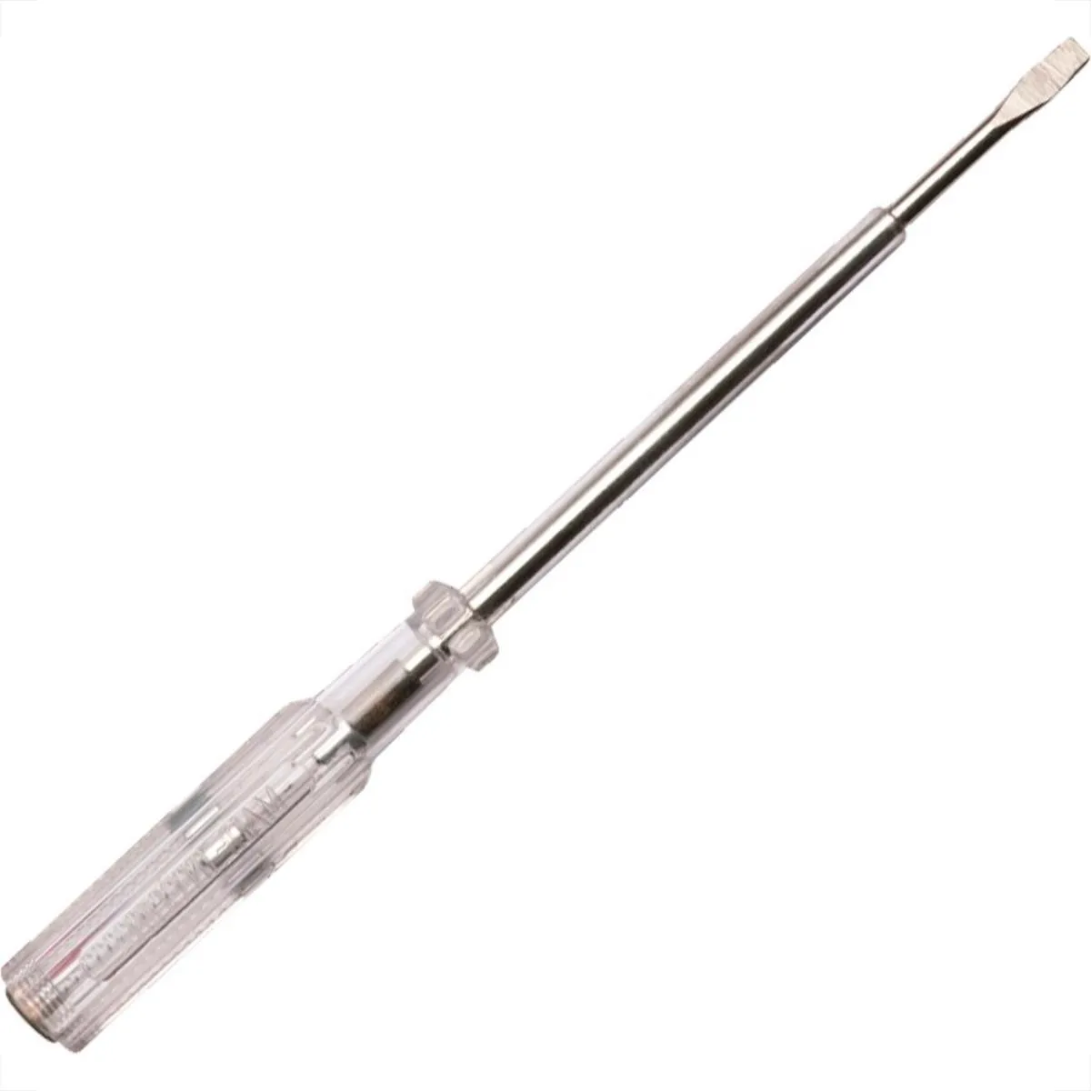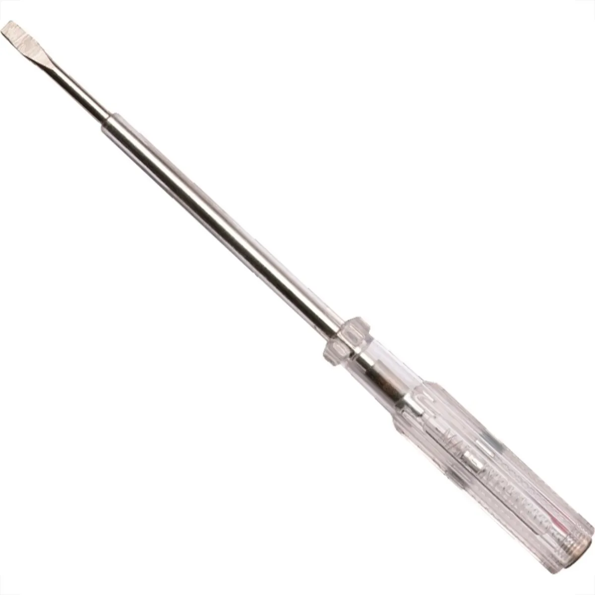A chave de teste grande da marca EDA (frequentemente referenciada pelo tamanho de 8 polegadas ou 190 mm), é uma ferramenta manual projetada para identificar a presença de tensão elétrica em circuitos de 100/110V a 500V. Ela funciona através de uma lâmpada interna (geralmente neon) que acende quando a ponta metálica toca um condutor energizado e o usuário encosta o dedo na extremidade oposta, fechando o circuito com o t