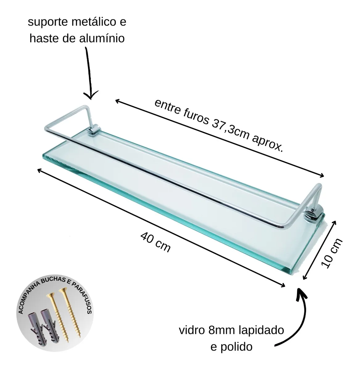 O Porta Shampoo Reto De 40 Cm, apresenta um design reto e minimalista, medindo 10 x 40 cm, que se encaixa perfeitamente em qualquer ambiente. O vidro incolor de 8mm confere durabilidade, enquanto o aro de alumínio e o suporte de Zamak proporcionam resistência e estabilidade.